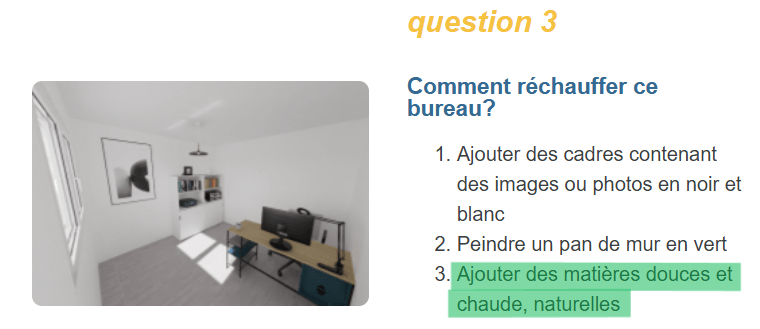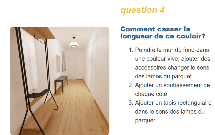 DiffĂ©rents thĂšmes seront abordĂ©s dans ce quiz comme la couleur, diffĂ©rentes problĂ©matiques que vous ĂȘtes amenĂ©s Ă rencontrer (amĂ©nager un long couloir, rĂ©chauffer une piĂšce,âŠ) , styles et ambiances, âŠ